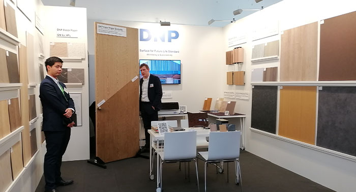 大日本印刷・ドイツ支店はBauに初出展、建材(プリント材)を展示しました。 ドイツでは販売拠点があり、工場は日本のみ、製造・品質管理が一貫して行われている安心感があります。