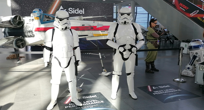 世界初のボトル製造用レーザーブロー成形技術を発表するなど複数の新技術を展示発表。この技術により、より細分化されたポイントにレーザーが当てられるようになるということで、レーザーとスターウォーズのライトセーバーをかけた演出はベタですが、来場者の多数から興味をひいたのではないでしょうか。(私調べですが、入り口で記念写真撮影率が高かった気がします。ブースではコマンダーとトゥルーパーが集まるスーパーイベントタイムも)