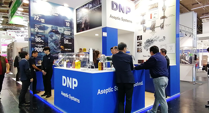 大日本印刷(DNP)もdrinktecは初出展となります。今回はアセプティック・システム社としての出展ですが、ペットボトルの無菌充填システムを中心にラインナップしています。日本、アジア圏ではすでに手応え(しっかりと根付いている)もあり、これからは新たに欧州、中等、中央アジアなど各地域での認知度そしてマーケットのシェア拡大を目指ているとのこと。