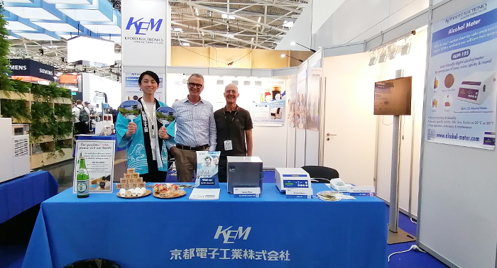 京都電子工業は、2000年前から海外進出を行なっています。ガスボリューム・エアコンテント測定装置をメイン展示し、アルコール類の振動式密度計と、その横には来場者の目をひく京都の地酒と枡も合わせて日本らしさもアピール。欧州市場ではすでにガスの測定装置は有名ビールメーカーにも採用されています。