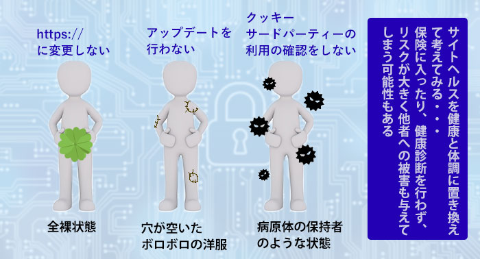 しかし、サイトの安全性を確認し改善することは、体調管理を整えて、健康診断をしっかりと行うことと同じ。 大きなリスクの回避となり、最終的には経費の削減にもつながります。