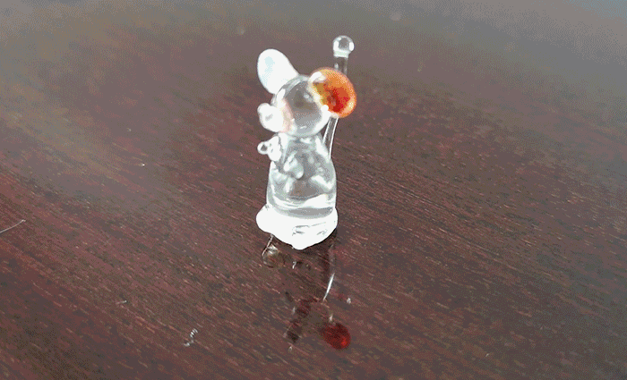 ガラスの棒からバーナーを使ってその場であっという間に作品を作り上げる職人さん。 日本の国旗の色、白と赤でネズミをつくってもらいました。 職人の技術もさることながら、まっすぐ細く伸びる小型バナー(製造元 MIG- O-MAT)にも驚きです。