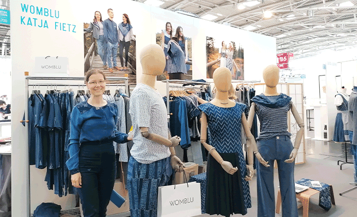 一見すると欧州風なのに、どことなく日本の藍染の趣も感じるテキスタイルを使用し、パターンも洋裁をメインに、和裁の特徴が混ざり合ったデザインのブランドWomblu ドレスデン出身のデザイナーが伝統的な「Blaudruck」を使ってテキスタイルから作ります。