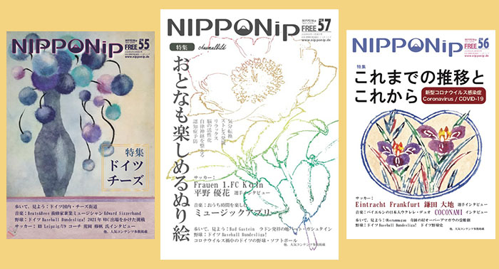 会場内では海外進出に役立つ書籍の販売、各種資料、フリーペーパーコーナーがあります。 毎年ご好評いただいている弊社発行のNIPPONipも配布して頂いておりますので、ぜひ御手にとって見てみてください。 今年は最新号の「おとなのぬり絵」特集(中央) ほか、「ドイツ国内での新型コロナの推移とこれから」特集など興味深いドイツ国内の興味深い特集号をいくつか配布しています。