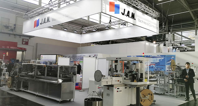 J.A.M. 日本オートマチックマシン株式会社は長年productronicaに出展している日系企業です。ゆったりした空間のブースには、複数の主力商品が展示されていました。欧州一番人気といわれる両端圧着挿入機(JACK 700)、ドイツで初お披露目の両端圧着・防水シール・ハウジング挿入機( ZX305-CE)など。